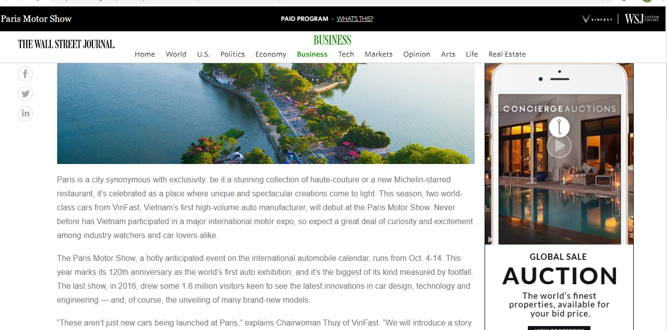 Vinfast đăng bài PR quảng bá trên website The Wall Street Journal
